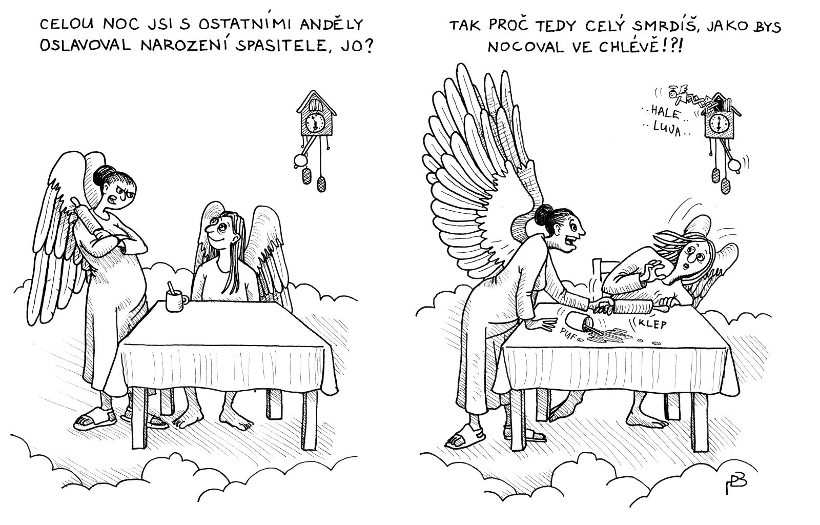 Pavel Bosman: Andělská oslava (kreslený humor)
