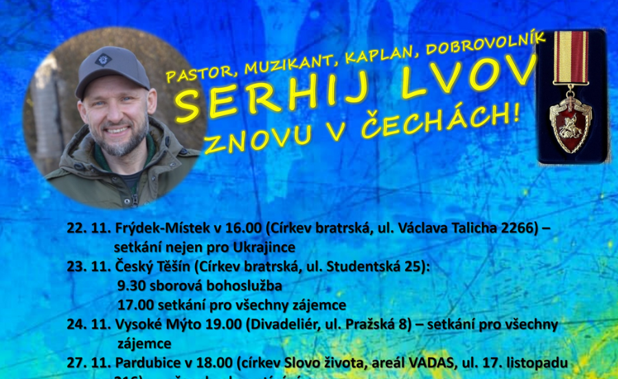 Proč má smysl nadále pomáhat Ukrajině? Jak žijí civilisté v oblastech denně ostřelovaných ruskými raketami? Vyprávění a písně Serhije Lvova, pastora sboru Vinice v Kyjevě, který jezdí s humanitární pomocí a koncerty na východ Ukrajiny.