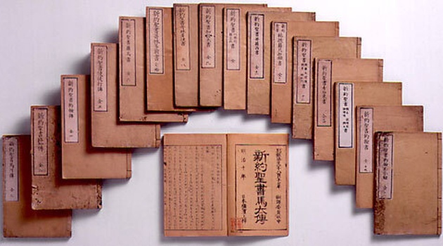První biblickou knihou, která byla přeložena do japonštiny, bylo Janovo evangelium, které v roce 1837 přeložil Karl Gützlaff, první luteránský misionář v Číně. V roce 1880 výše zmíněné biblické společnosti vydaly Nový zákon přeložený výborem složeným z protestantských misionářů a několika Japonců. O sedm let později dokončily i Starý zákon.