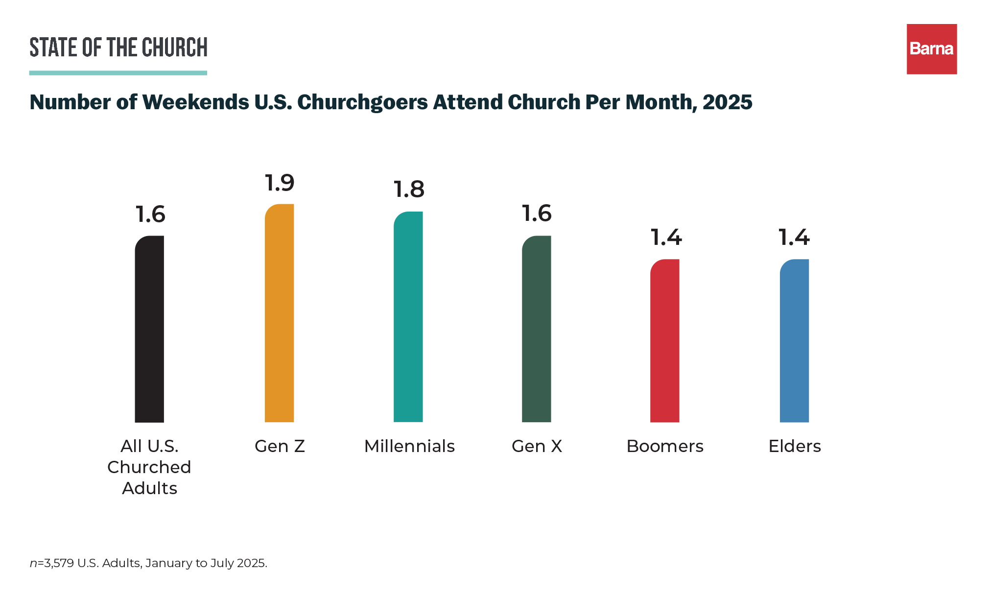 Typický návštěvník církve z generace Z ji nyní navštěvuje 1,9 víkendu za měsíc, návštěvníci z generace mileniálů v průměru 1,8krát. To je dosud nejvyšší návštěvnost církve mezi mladými v 25leté historii výzkumů Barna Group. Před pěti lety to byl zhruba jeden víkend v měsíci.